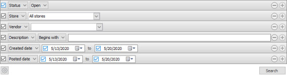 The purchase orders can be searched for in a filtered search. One filtering line is added for each type of filter. You can even save your preferred filtering settings and they will be available when you open the Goods receiving documents dialog next time.